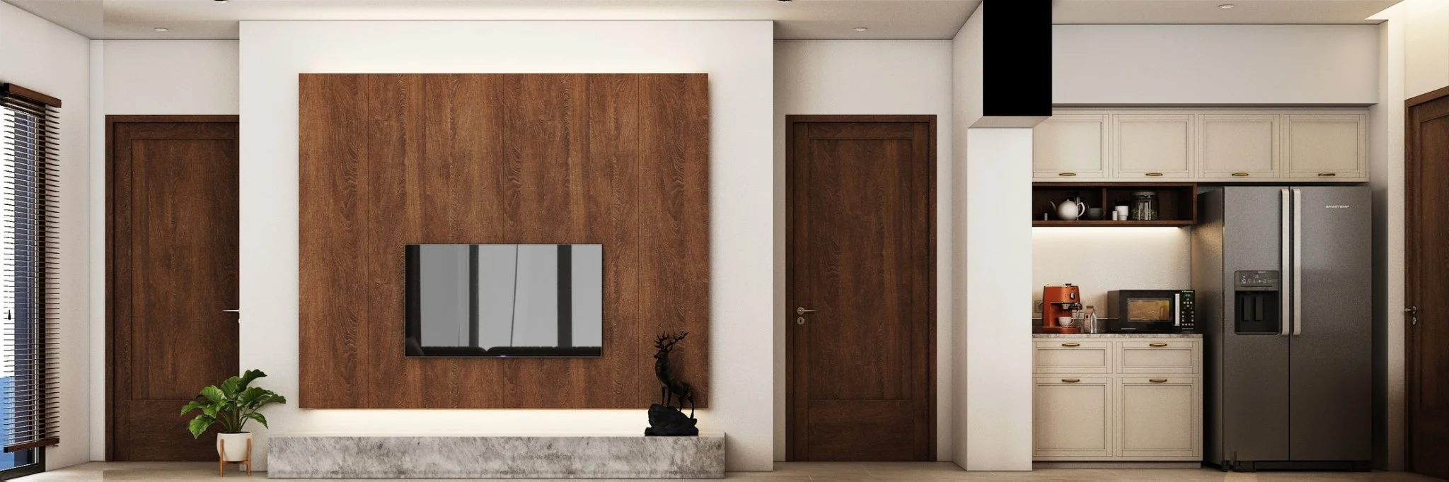 The TV unit is designed as a stone pedestal with a wooden wall creating a warm and strong presence for the living room.